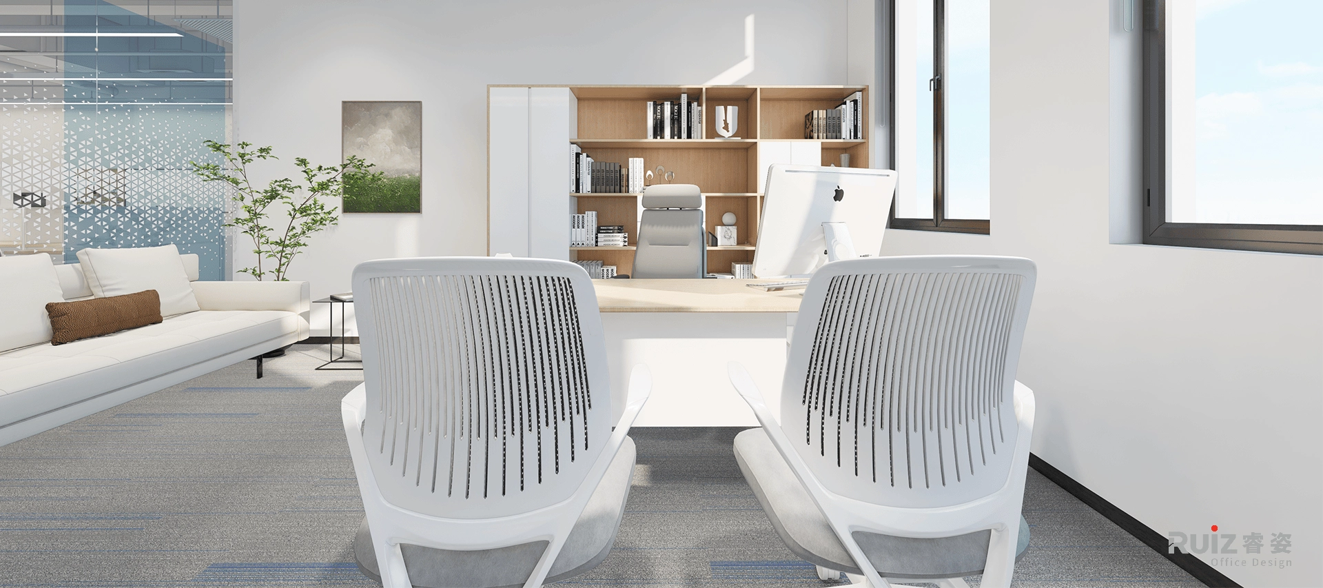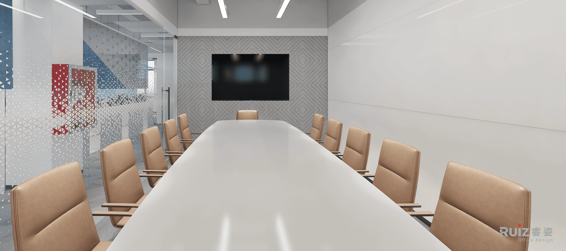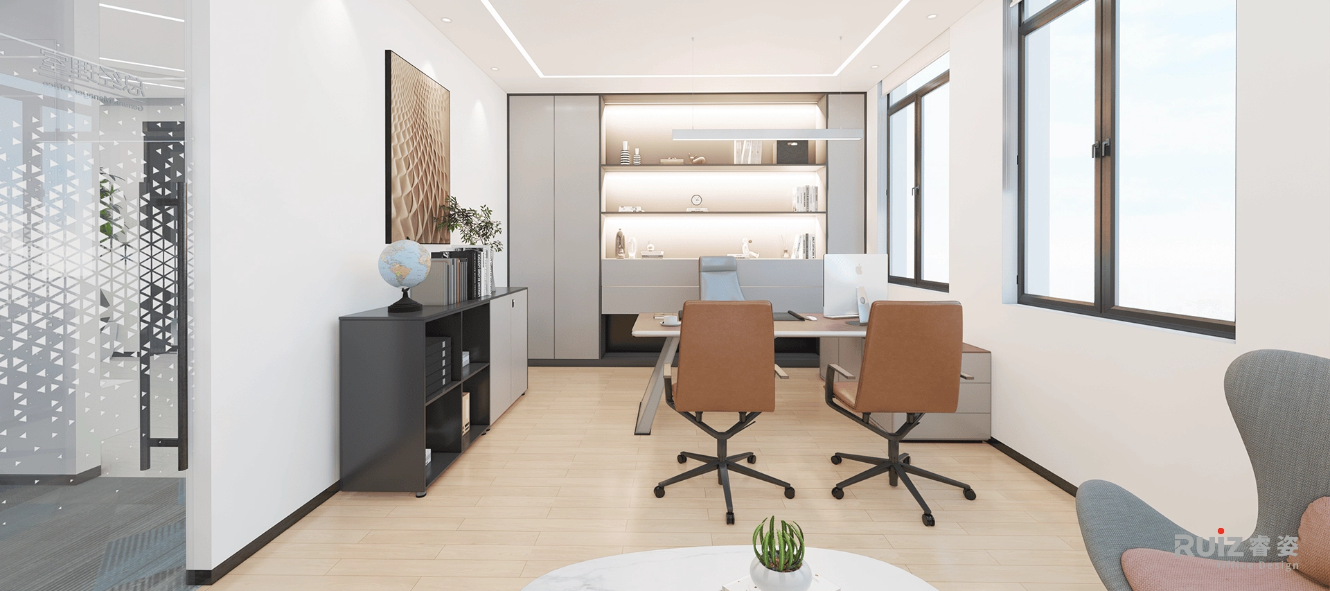 会议室延续裸顶工业基调,灰色管线保留粗犷质感,中央悬挂两条极简长条LED吊灯,聚焦照明并拉伸空间纵深感。核心配置白色哑光会议桌,搭配橙色皮质会议椅,以色彩碰撞激活讨论氛围;背景墙融合吸音板与嵌入式电视屏,侧边配备超白烤漆玻璃涂写板,实现书写、投屏与降噪多功能一体。整体以橙白对比、刚柔材质(金属与玻璃)及模块化科技设备,打造高效专注且充满张力的协作场景,呼应品牌活力基因。经理室采用极简白墙与浅灰背柜,搭配科技木地板,岩板桌、皮椅、悬浮书架及布艺沙发构成现代办公场景,线性灯与筒灯营造简洁光影,金属细节与绿植点缀平衡理性与温度。
