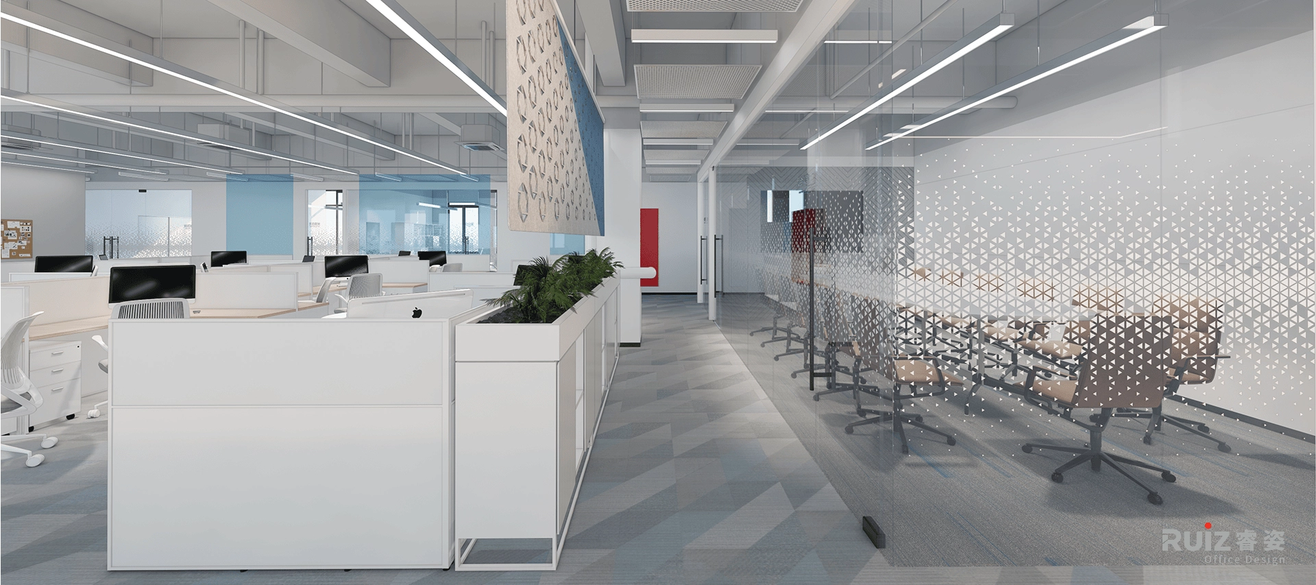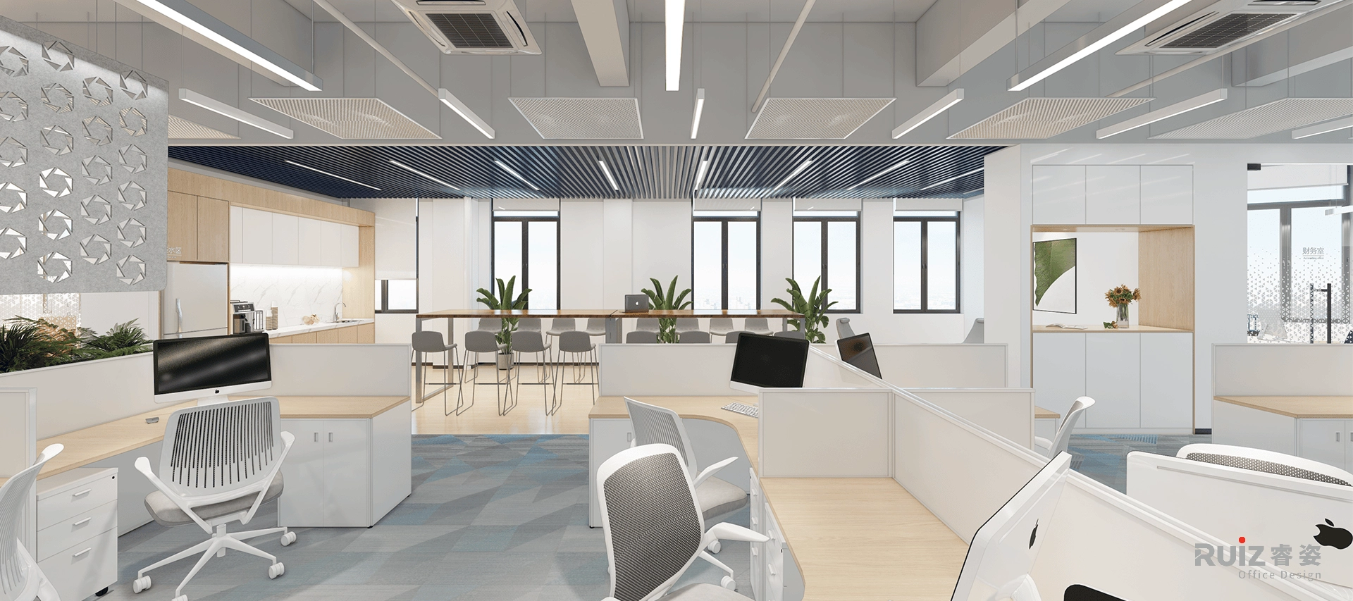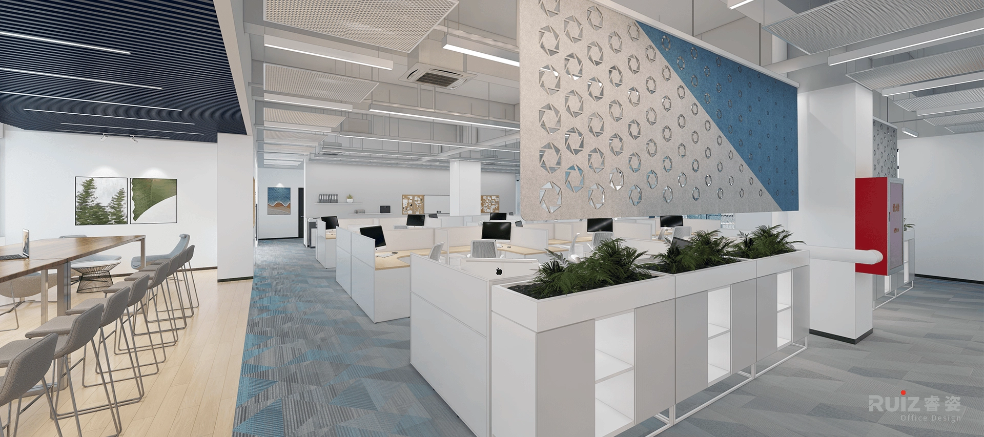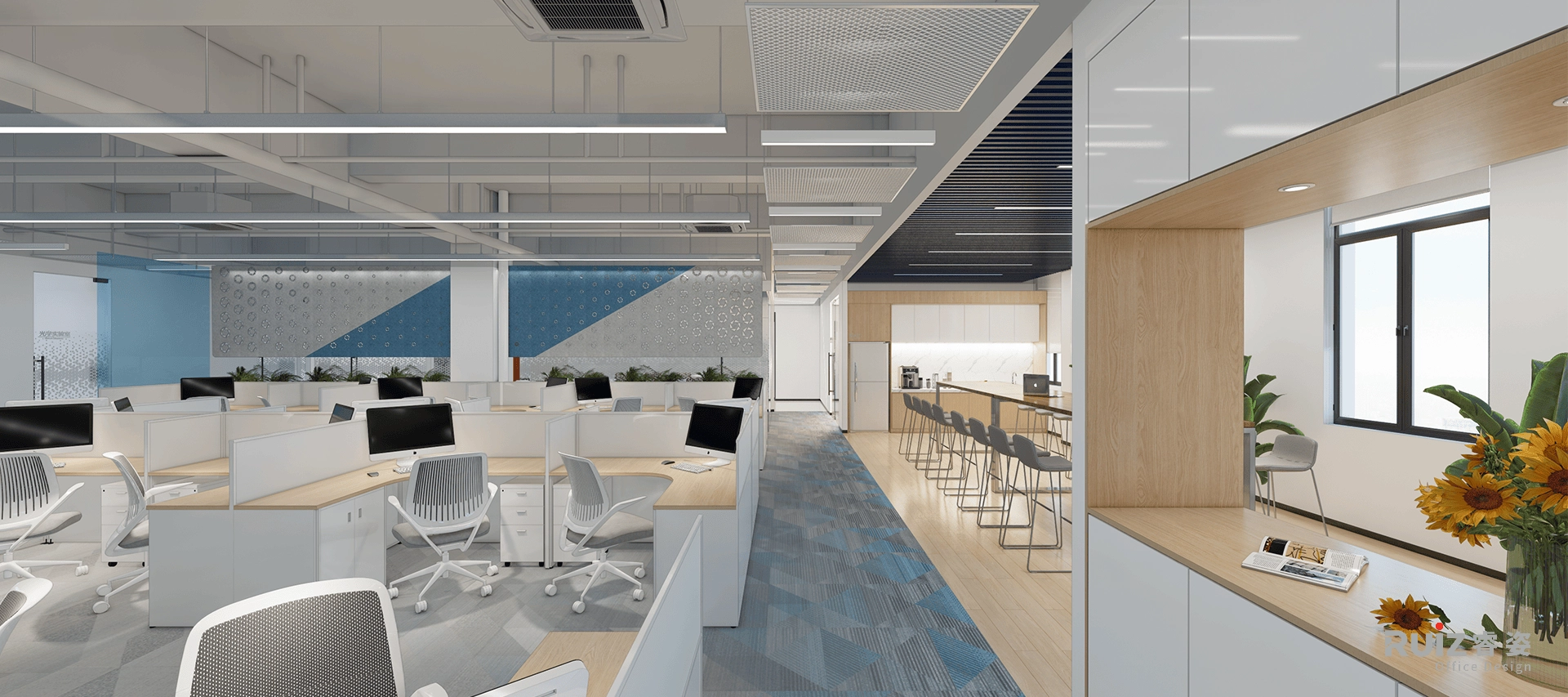 办公区以L形模块化白色桌组为单元,搭配科技木桌面(哑光饰面防眩光),形成简洁高效的工位矩阵;天花保留裸顶工业风,深灰色喷涂管线与条形灯结合,地面通铺蓝灰渐变地毯,通过色彩流动弱化方正布局,同时强化吸音降噪功能。茶水区切换为原木纹SPC地板,营造自然松弛的休憩氛围。整体空间通过材质冷暖对比、色彩渐变过渡及模块化组合逻辑,在工业基调中注入温润活力,实现高效协作与人文关怀的有机融合。