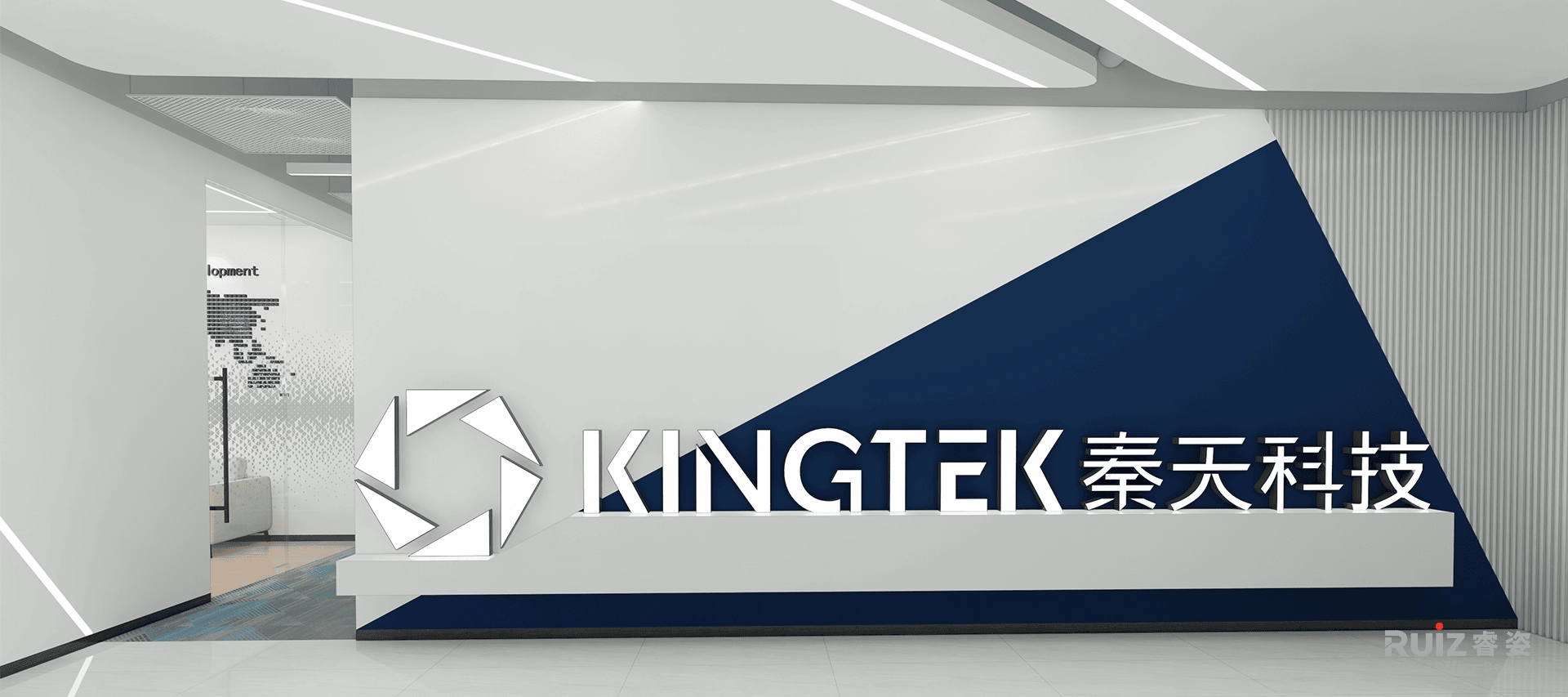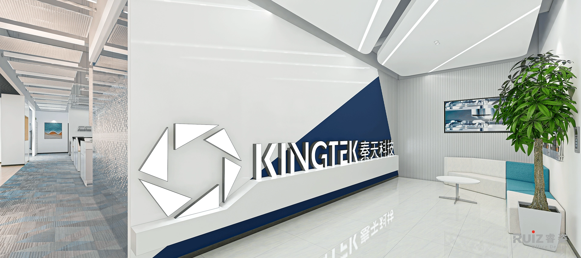 前厅以品牌Logo元素为核心,运用三角形拼接背景墙,辅以隐藏灯带,与落地发光立体Logo形成视觉焦点,强化品牌标识;造型石膏板吊顶嵌入线性灯带,通过几何线条与光影层次营造科技感与现代张力,整体空间以简约材质碰撞、动态几何语言及精准光效传递企业创新、专业与前瞻性的品牌形象。